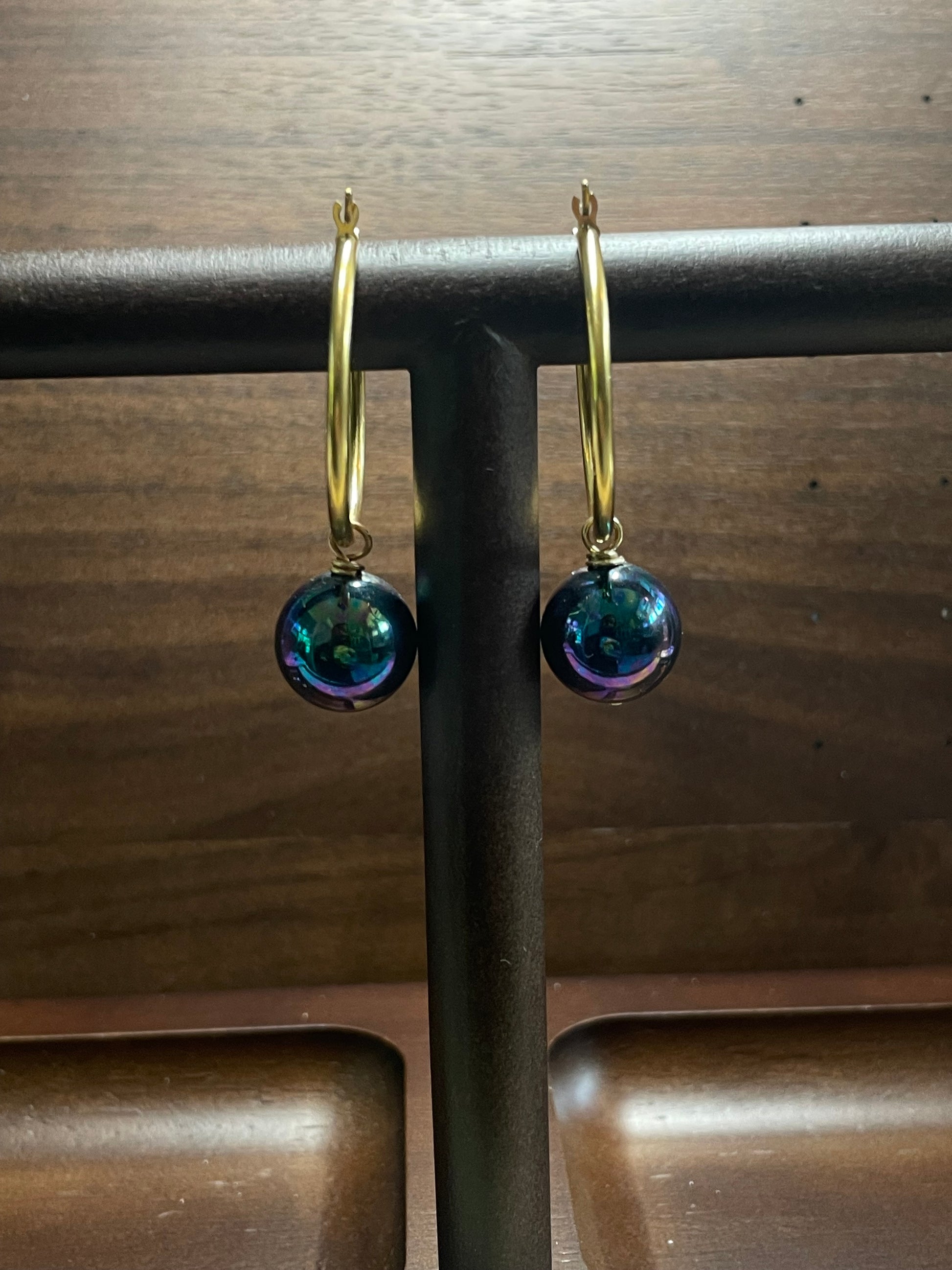 Part of our Pearl Drop Collection, these surfer-girl hoops feature a shimmering shell pearl paired with a sleek 18K PVD gold-plated swing hoop. Choose from four beach-inspired shades: